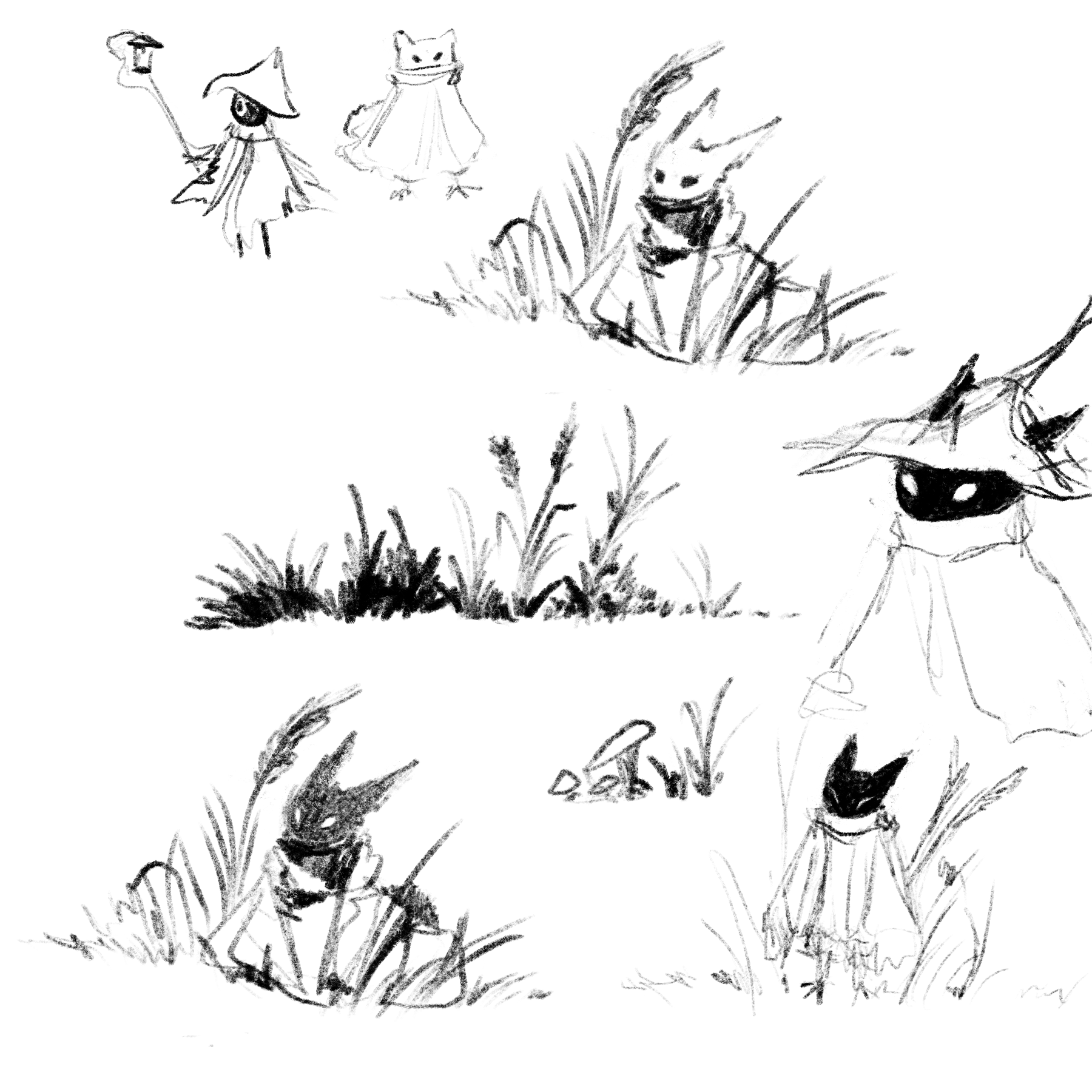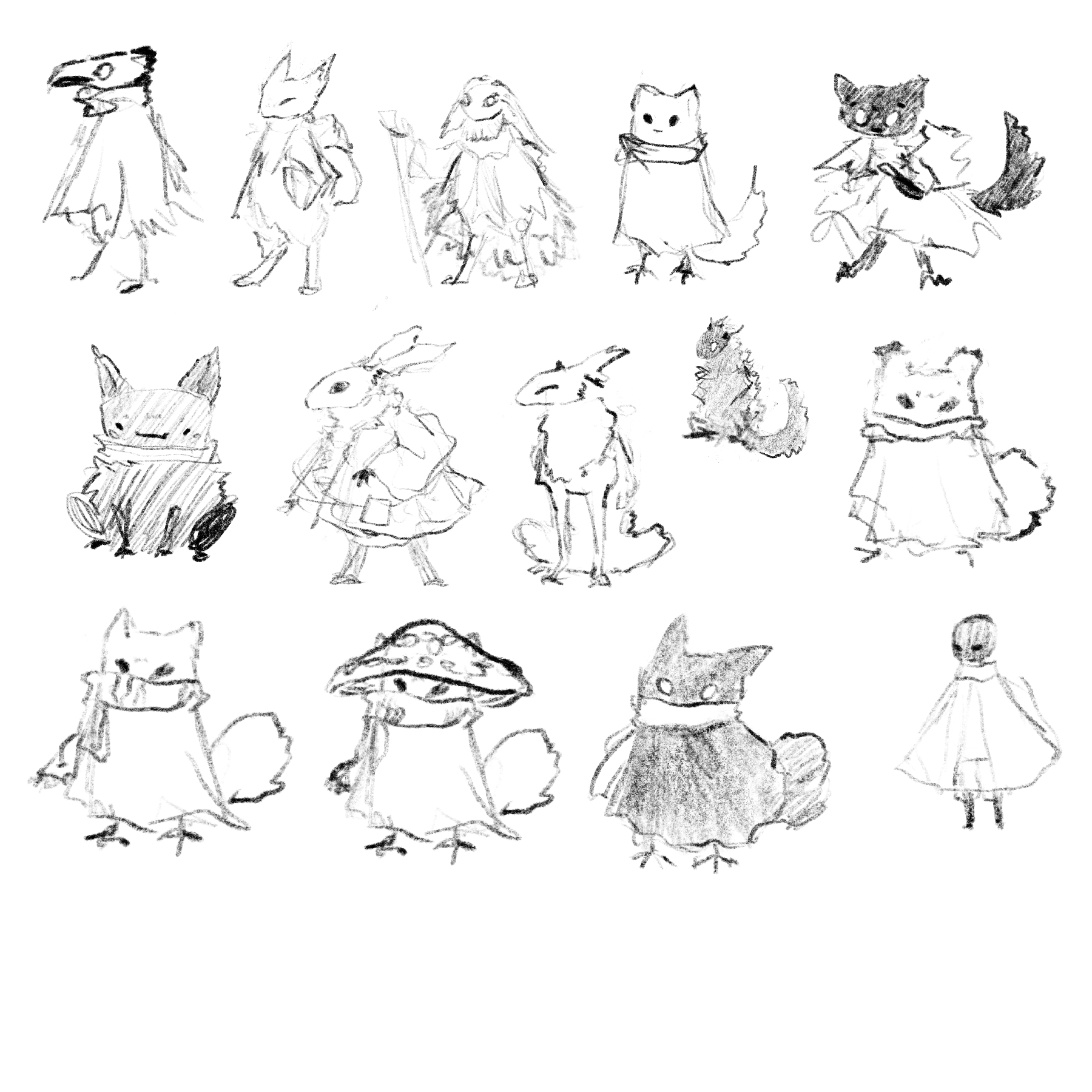Since I had the most experience both in drawing and creating games we decided that it would be me that would create the main character. I started the process by creaating a few concept sketches of different designs. We wanted the character to be pretty anonym from the beginning so that it later could gain more character and be equipped with different items and clothing it found or gained during the game.