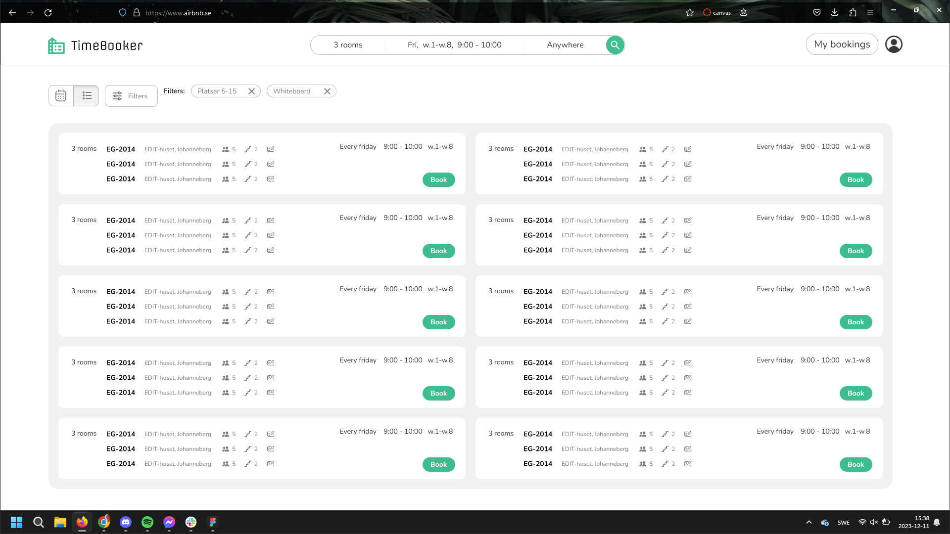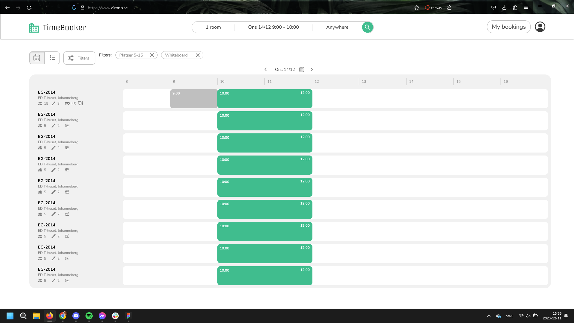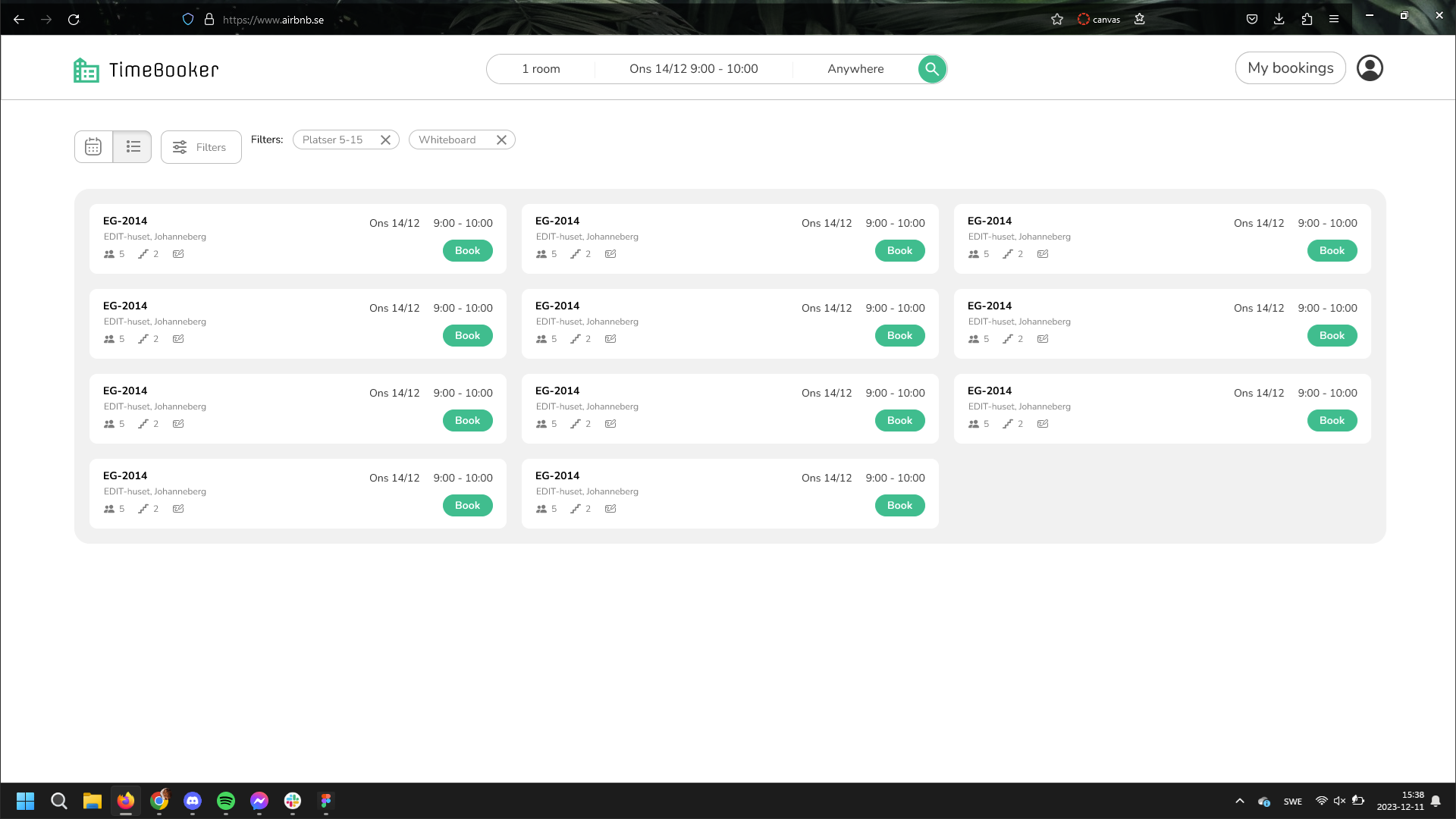 The starting page where you can see a schedule for all rooms that fits the current search and filtering. In the headbar you can see a searchbar that is always visible from all pages so that it’s easy to access.