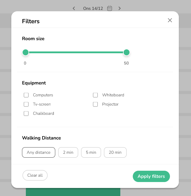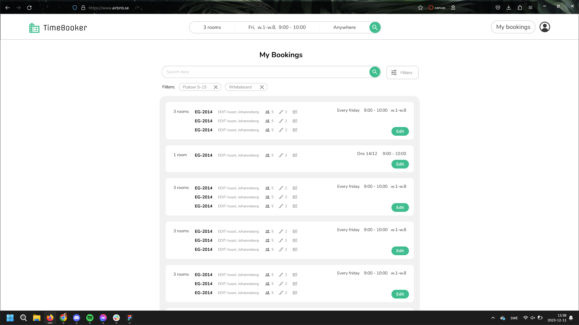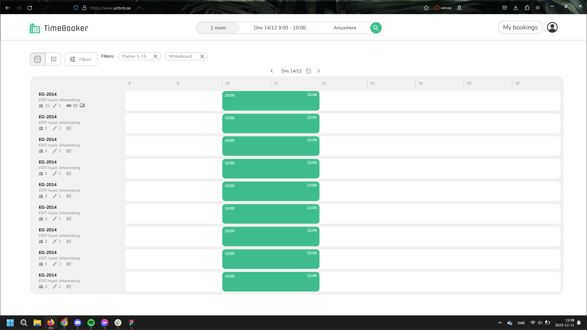 The starting page where you can see a schedule for all rooms that fits the current search and filtering. In the headbar you can see a searchbar that is always visible from all pages so that it’s easy to access.