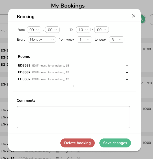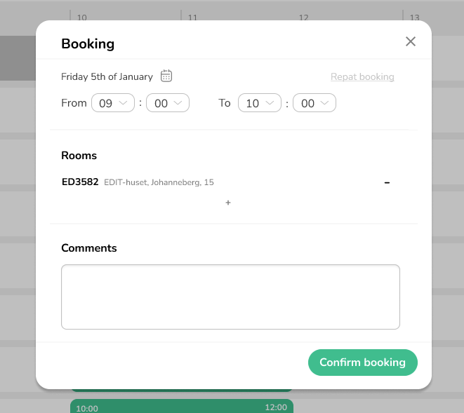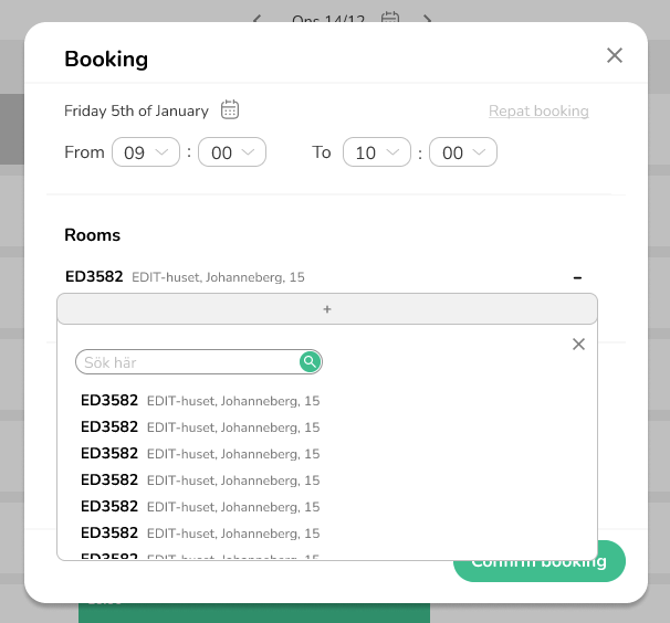 A lot of this information is visible in the schedule as well as the list view but in the form of icons. To create a booking you simply have to click somewhere on the schedule to book that time slot. Then a popup appears where you can further specify the time as well as what rooms to book and add additional ones if desired, and add any comments that you want. If you’ve already specified that you want several rooms you first have to choose all the rooms you want before the booking confirmation pops up.