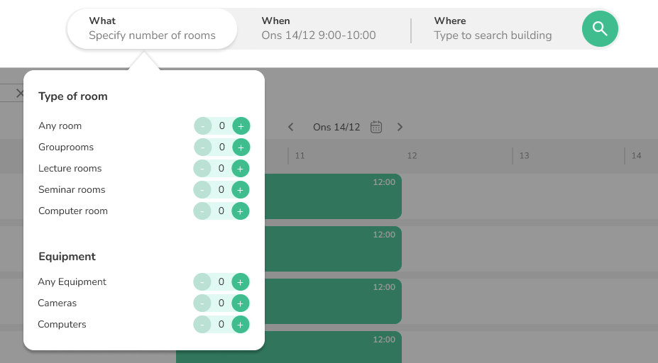 If you press on the search bar you can set a few different options First the type of rooms/equipment you want and the number of each.