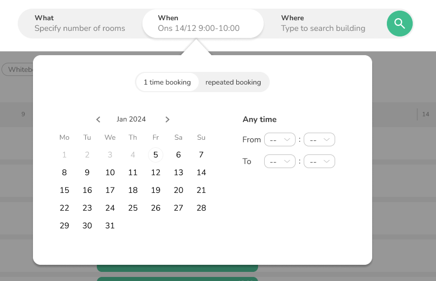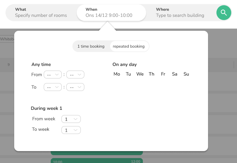 Second when you want your booking to be made, here you can choose between having a single booking or one that repeats over a a secifiedd number of weeks. You can choose to leave the time blank if you want to find one on your own in the schedule view or get recommendations of times in the recommended list view.