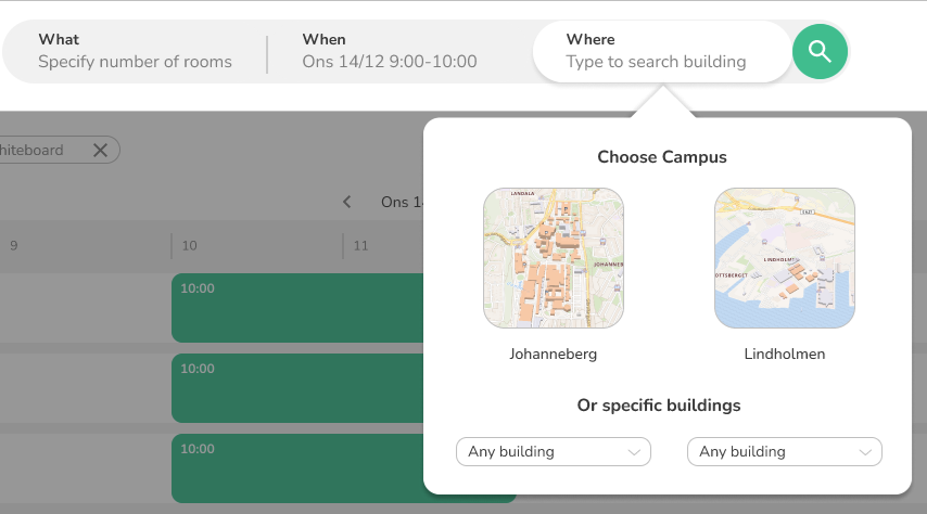 Then you can choose either which campus the rooms should be on or search for specific building or find them in a dropdown menu.