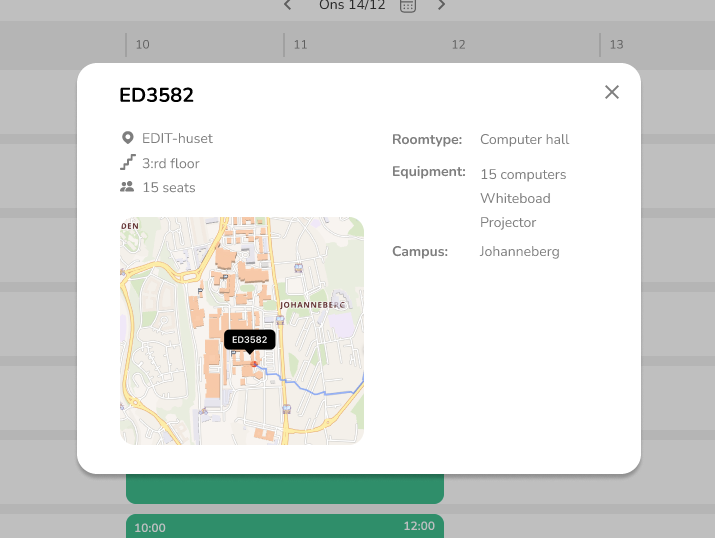 After you’ve specified all the options and filters you want you can then see the results of your search. To find additional info you can click on any room/equipment name to bring up a detail-view with all the specifics as well as a map to where the room is located.